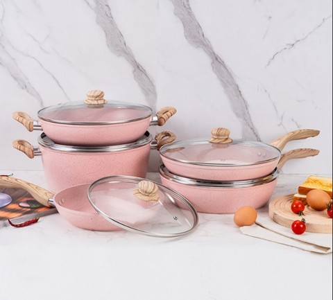 10 قطعة مزورة طقم حلل استانلس ستيل الوردي إناء طهي من الألمنيوم لا يلتصق به الطعام جهاز تسخين الطعام خزفي مجموعات تصنيع مباشرة بيع أصيص نباتات من السيراميك